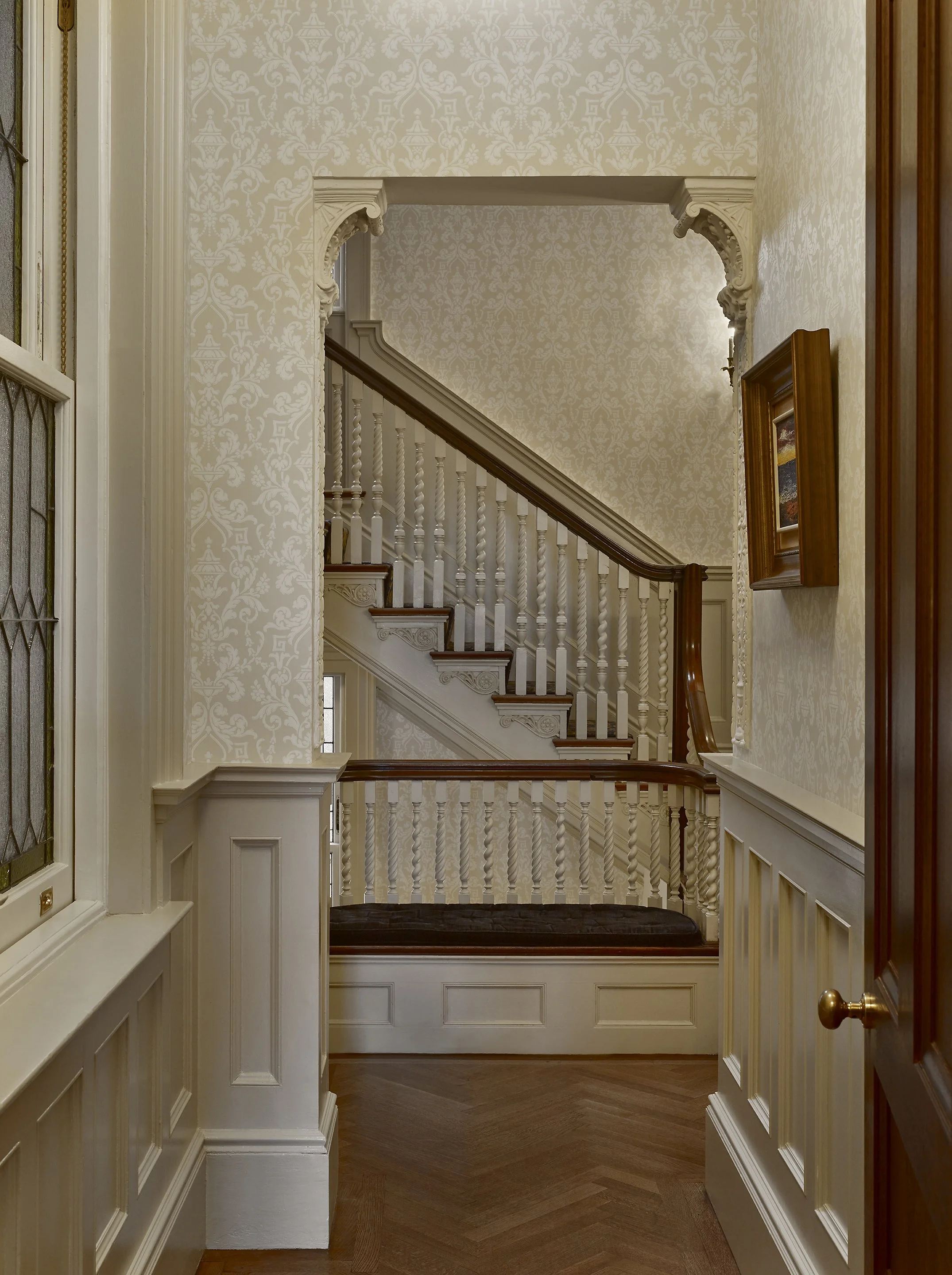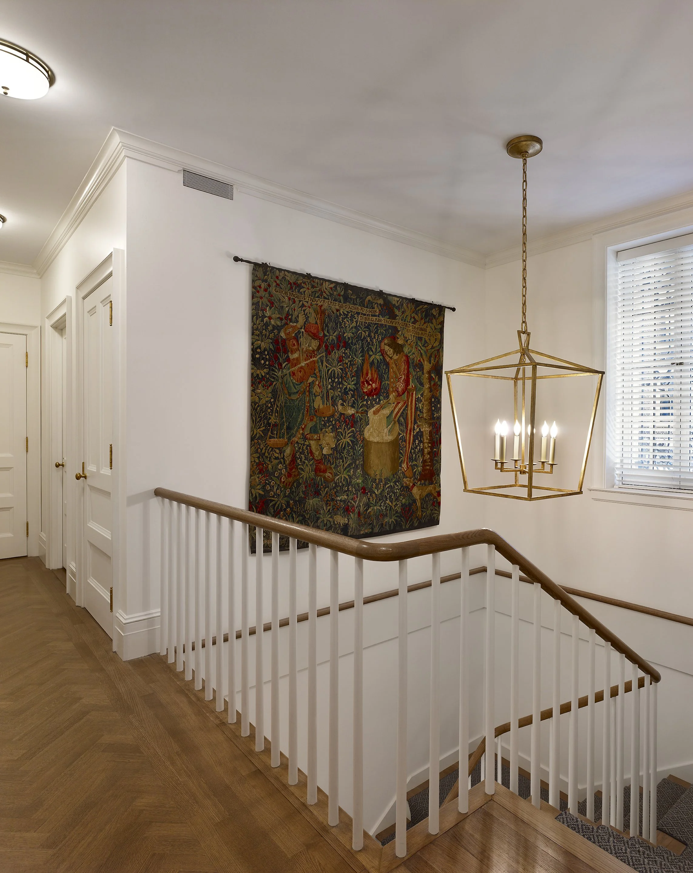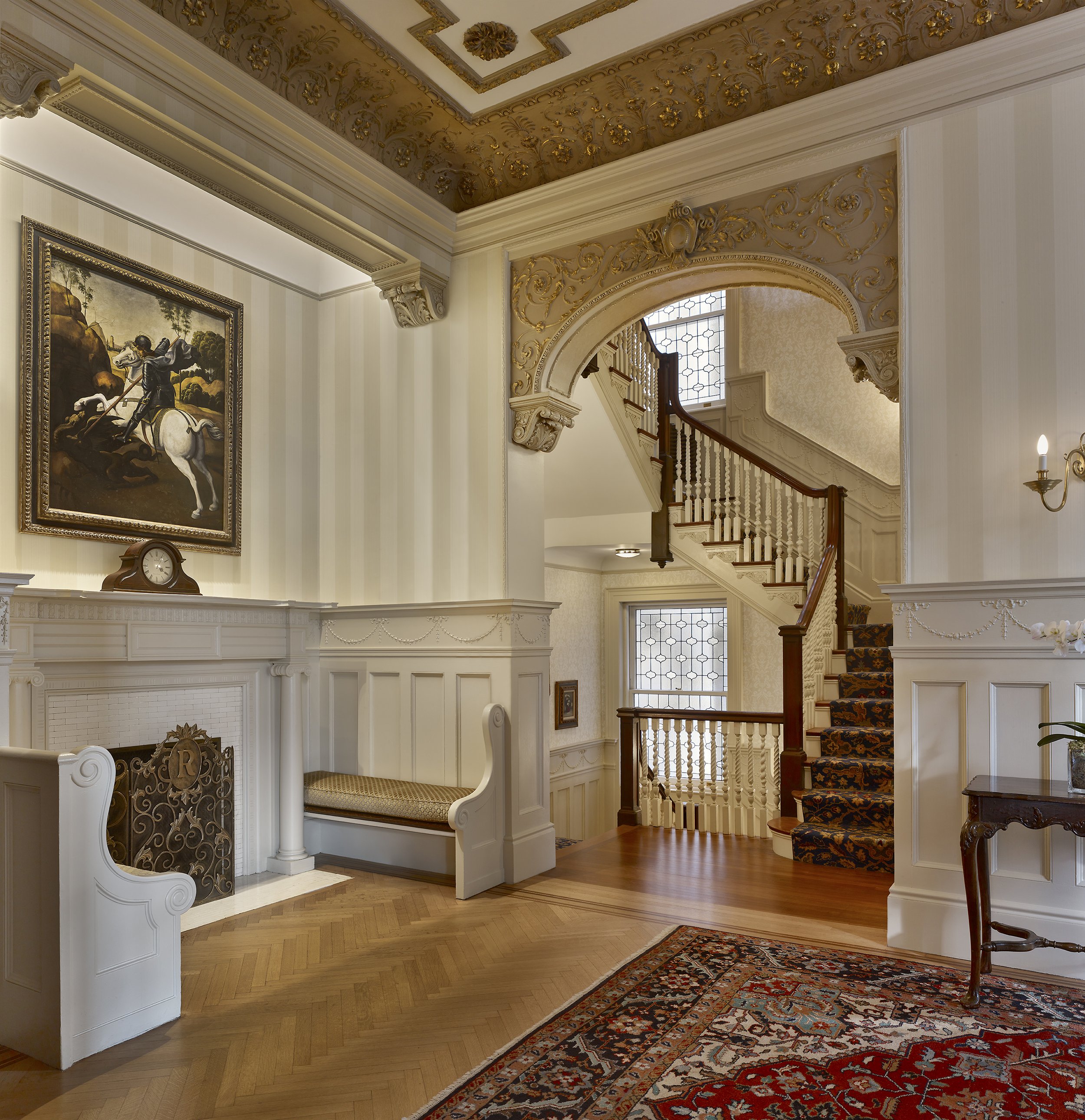 This project focused on adding new features and updating the MEP systems in a 1902 townhouse while maintaining and refreshing the building's historical elements. The upper floors, which include twelve bedrooms, were reorganized and improved by adding a few new bathrooms. A residential elevator was also installed. The exterior brick and stone were cleaned and repaired as needed to keep the townhouse looking great.